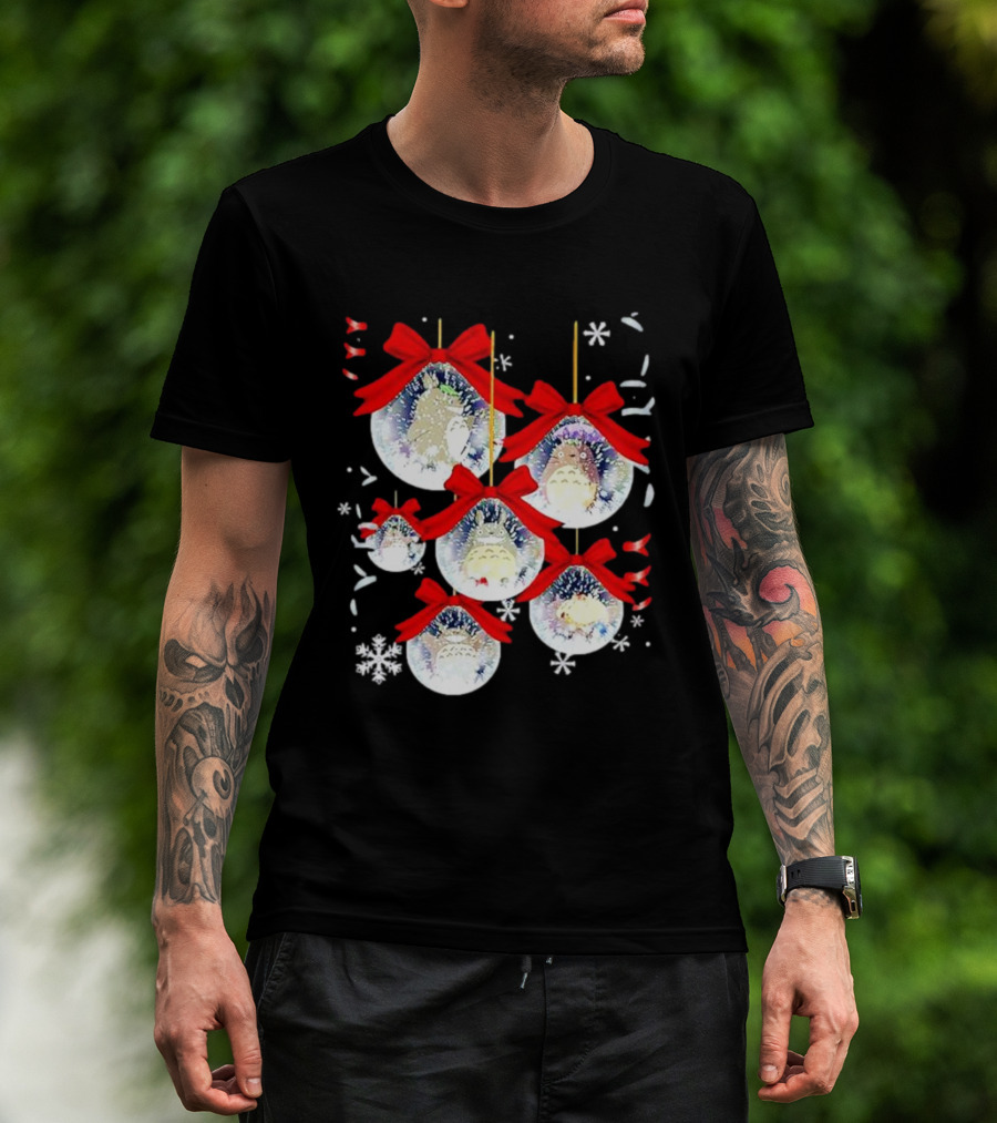 Totoro Chibi Christmas Ornaments With Snowflakes And Red Bows T-Shirt