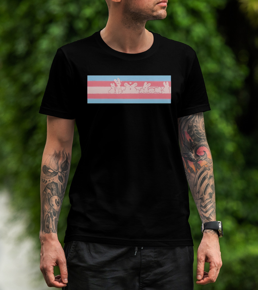 The Trans Flag Bunny Band Stripes T-shirt is designed for everyday wear and a consistent fit. Fabric is pre-shrunk ring-spun cotton with durable stitching. See the size chart below for exact measurements.