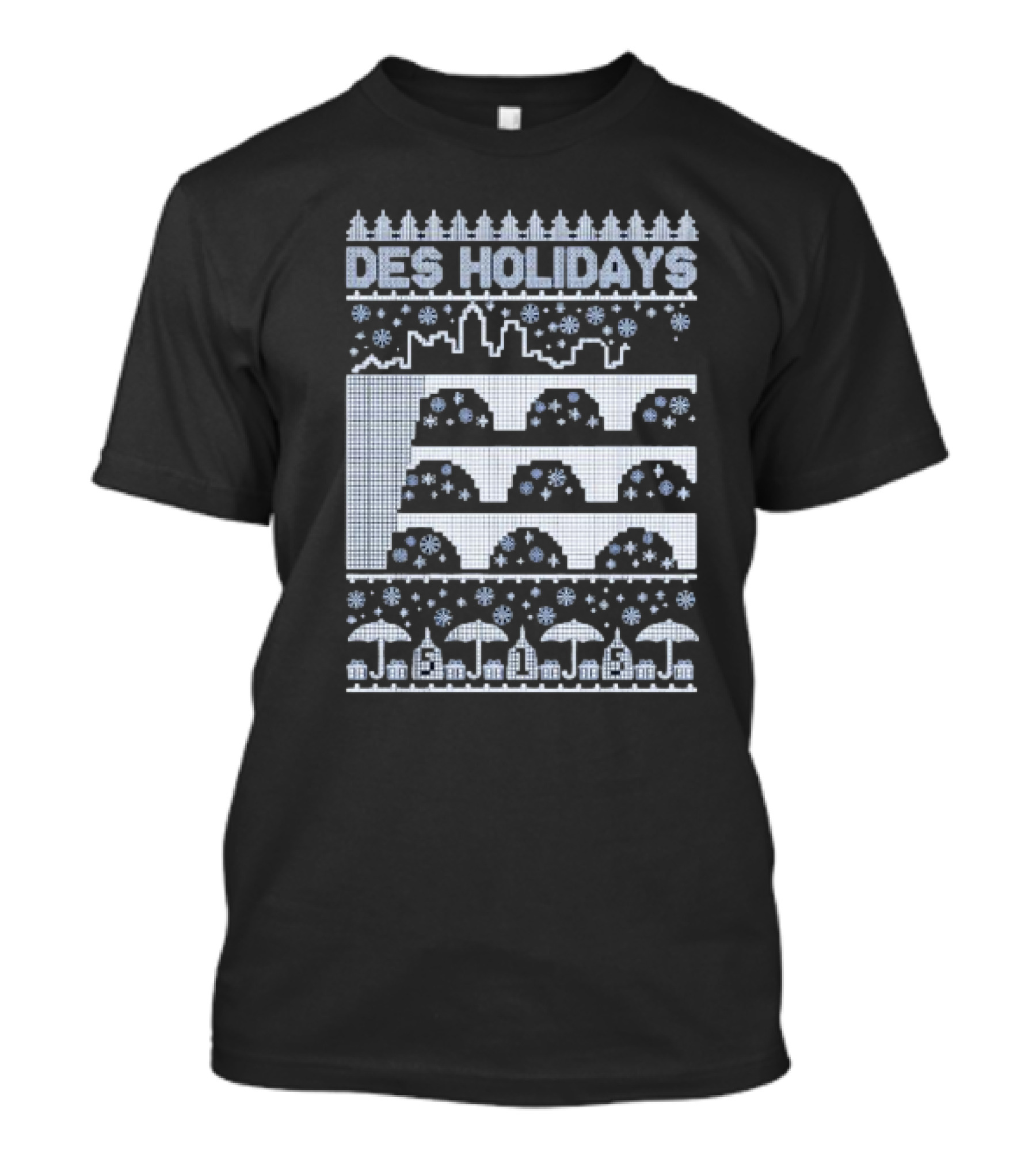 The Des Holidays Ugly Christmas Sweater City Skyline Snowflakes Tree T-shirt is designed for everyday wear and a consistent fit. Fabric is pre-shrunk ring-spun cotton with durable stitching. See the size chart below for exact measurements.