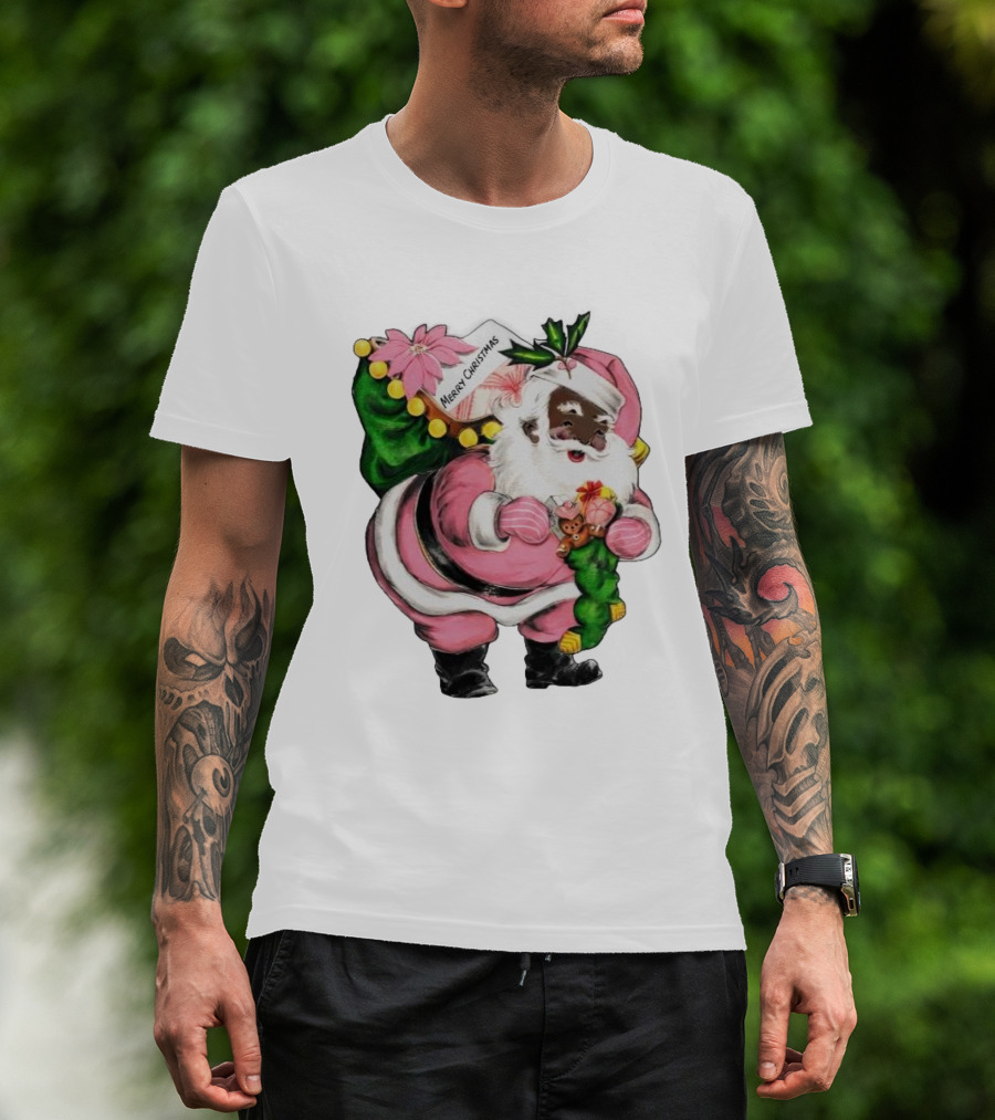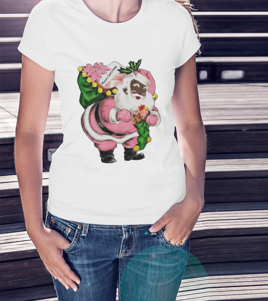 Merry Christmas Santa Claus Wear Pink Outfit With Sack And Toys T-Shirt