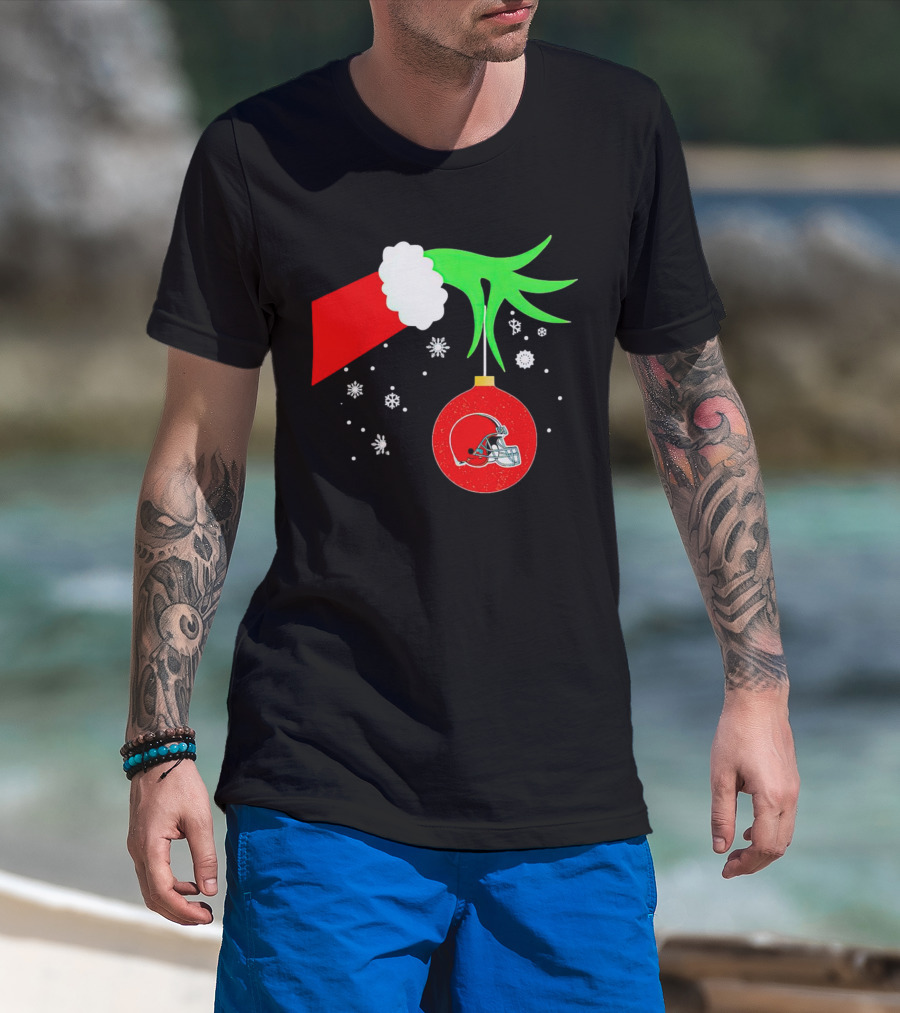 The Grinch Holding Cleveland Browns Ornament With Snowflakes T-Shirt