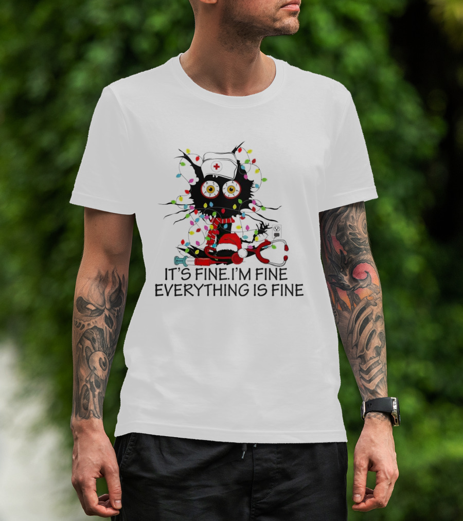 The Black Cat Nurse It's Fine I'm Fine Everything Is Fine Christmas Lights Stethoscope T-shirt is designed for everyday wear and a consistent fit. Fabric is pre-shrunk ring-spun cotton with durable stitching. See the size chart below for exact measurements.