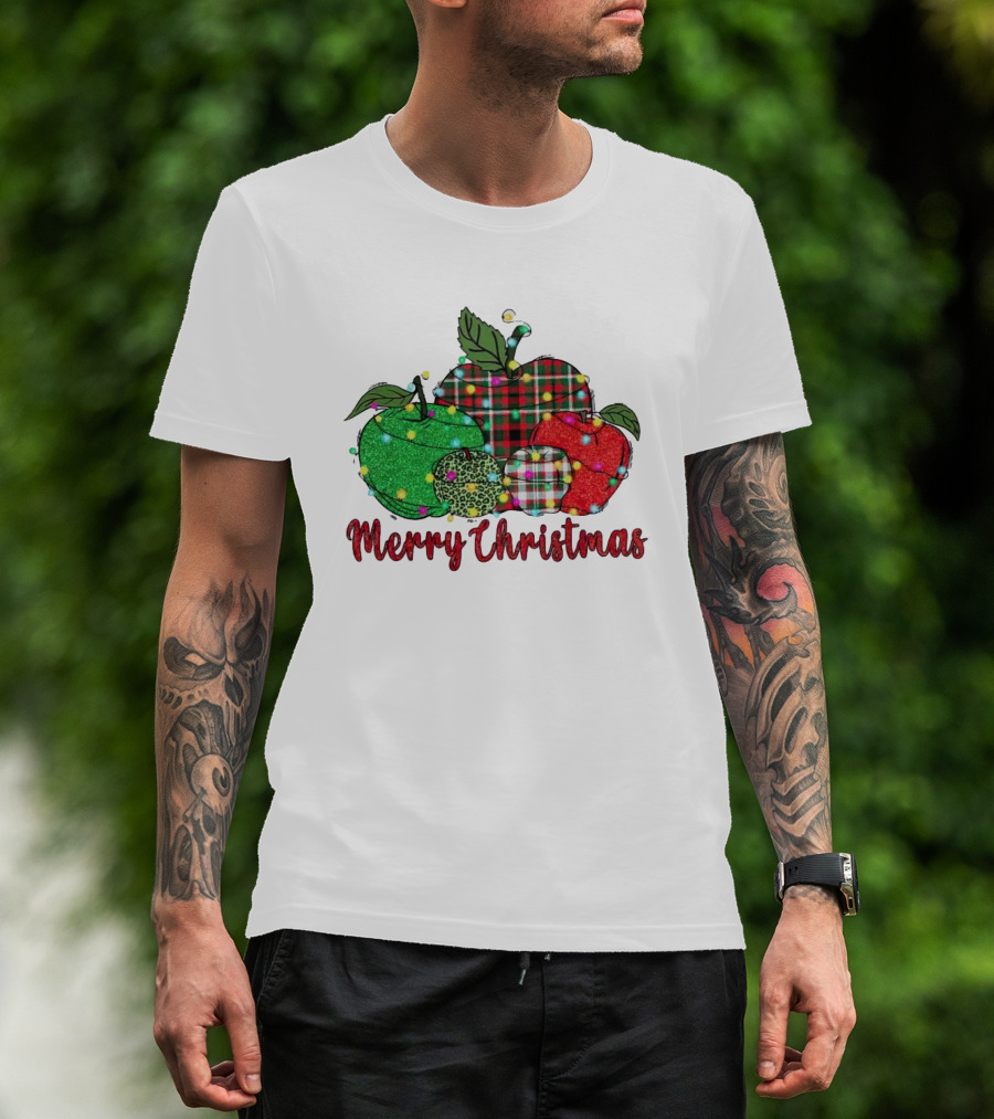 The Merry Christmas Apples Plaid and Lights T-shirt is designed for everyday wear and a consistent fit. Fabric is pre-shrunk ring-spun cotton with durable stitching. See the size chart below for exact measurements.