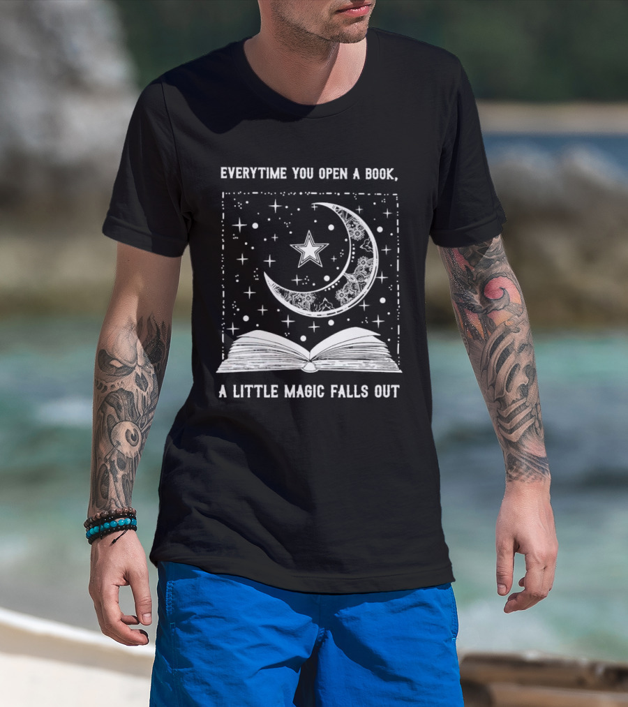 Everytime You Open A Book A Little Magic Falls Out With Starry Crescent Moon And Open Pages T-Shirt
