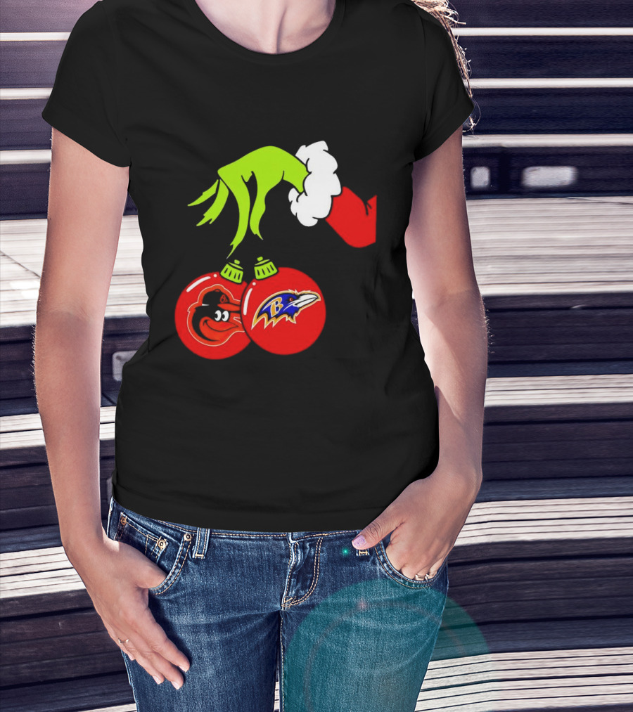 Grinch Hand Holding Baltimore Ravens And Orioles Christmas Ornaments T-Shirt