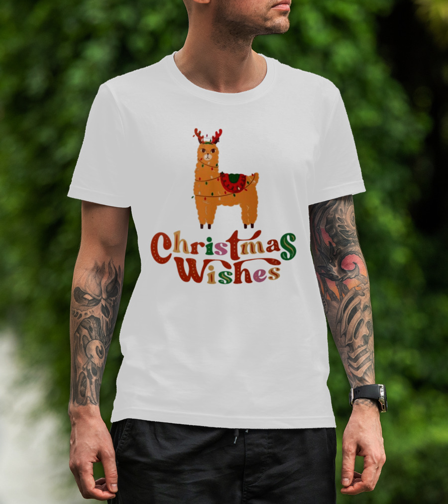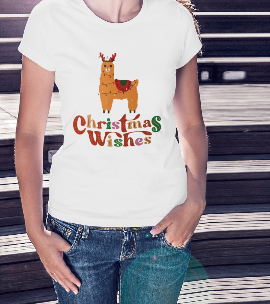 Christmas Wishes Llama Reindeer With Lights T-Shirt