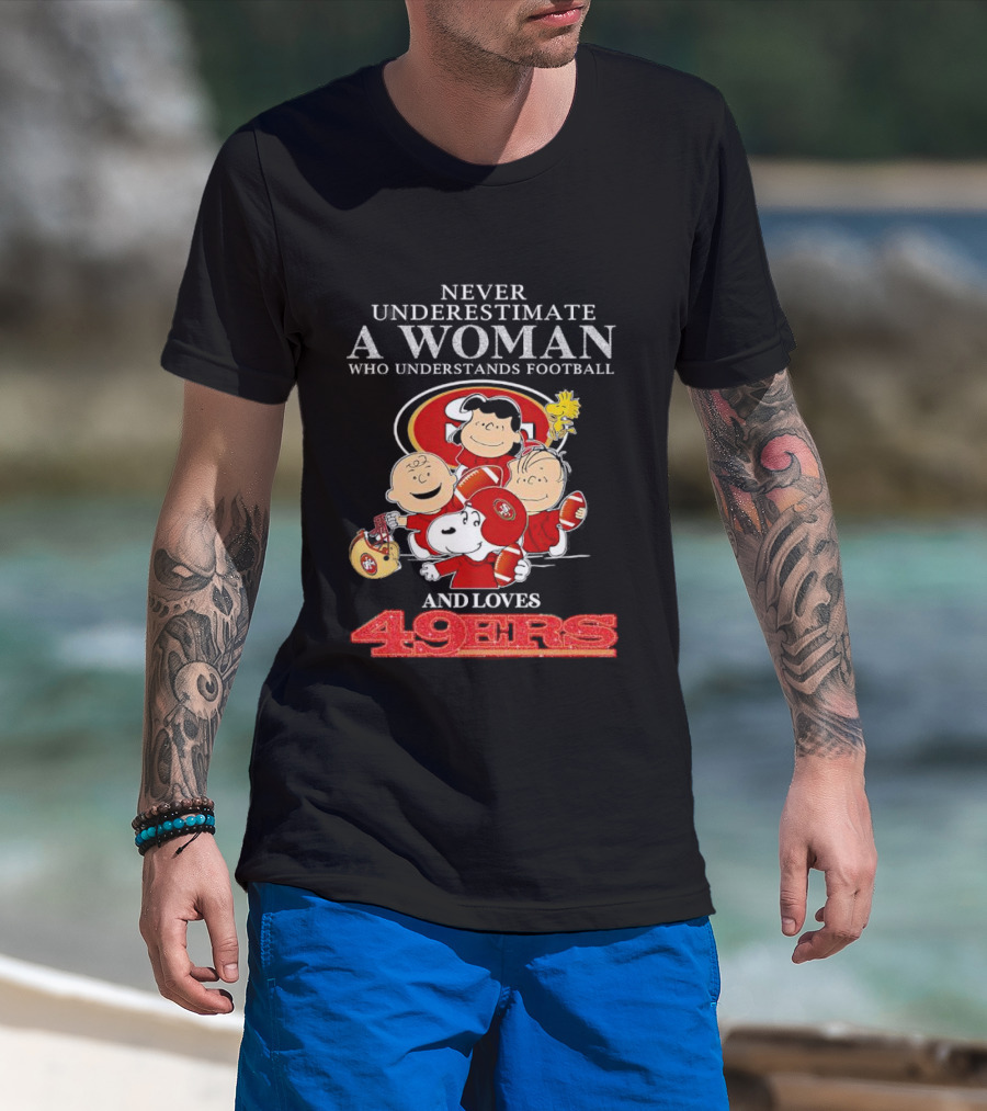 Never Underestimate A Woman Who Understands Football And Loves 49ers With Peanuts Characters T-Shirt