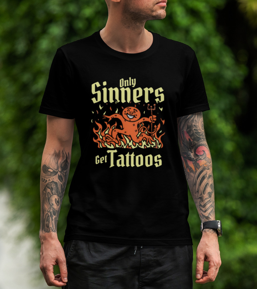 Gotfunny Only Sinners Get Tattoos Gingerbread Devil In Flames T-Shirt