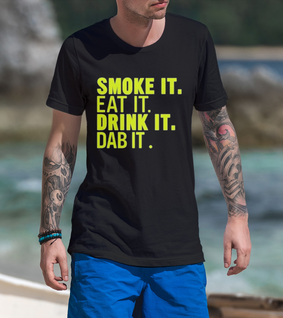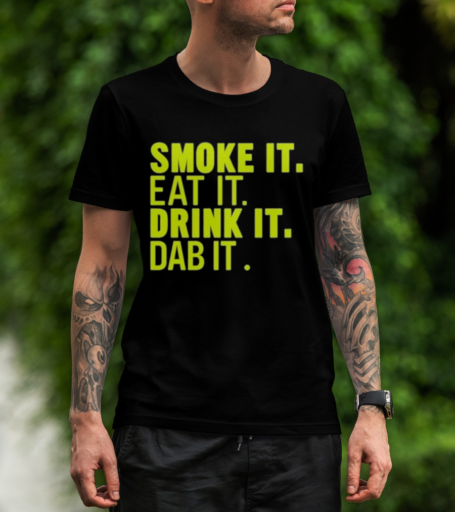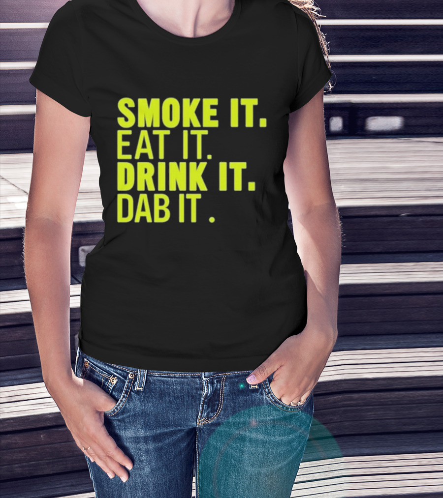 The Smoke It Eat It Drink It Dab It T-shirt is designed for everyday wear and a consistent fit. Fabric is pre-shrunk ring-spun cotton with durable stitching. See the size chart below for exact measurements.