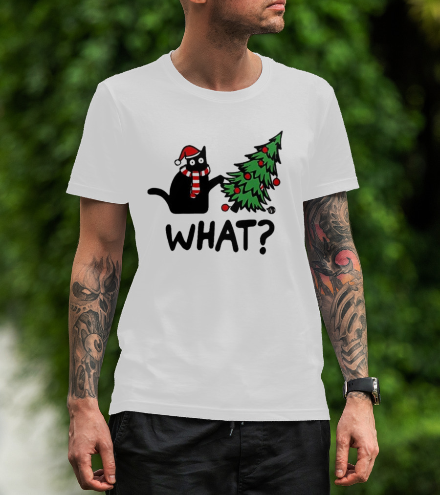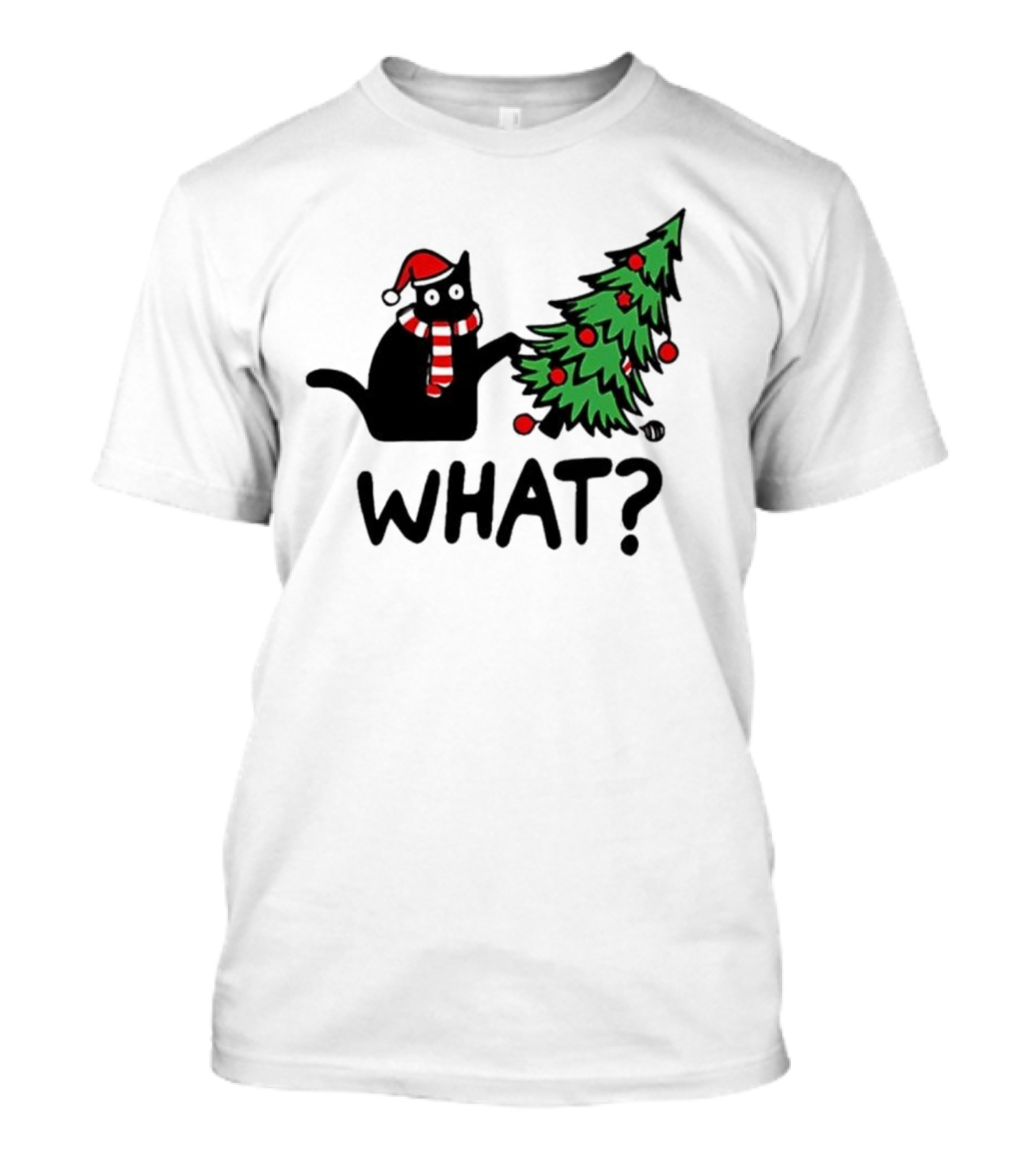 The What Cat Christmas Santa Hat Tree T-shirt is designed for everyday wear and a consistent fit. Fabric is pre-shrunk ring-spun cotton with durable stitching. See the size chart below for exact measurements.