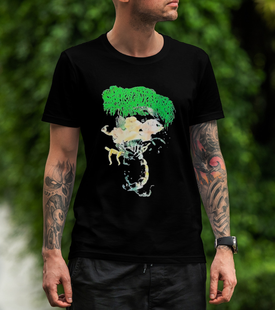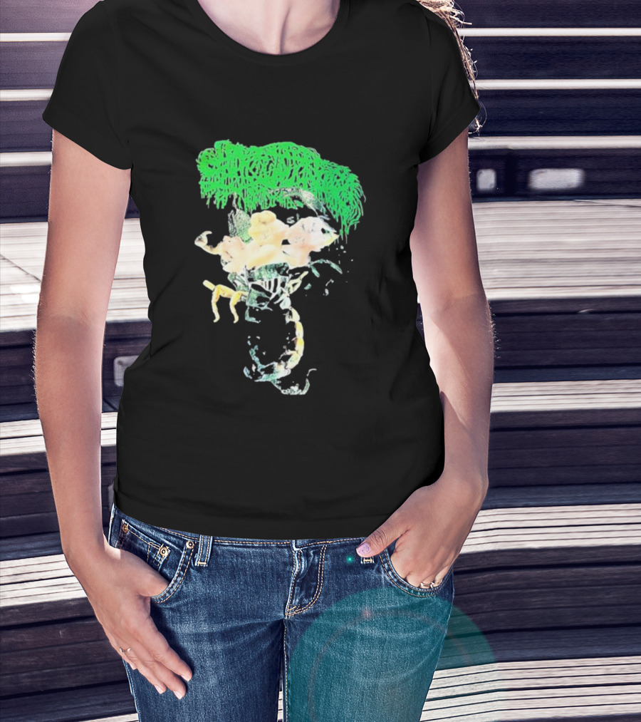 How much will this Sanguisugabogg Homicidal Ecstacy Abstract Green Dripping Text with Floral Skull and Spine shirt shrink?