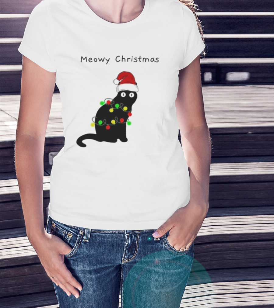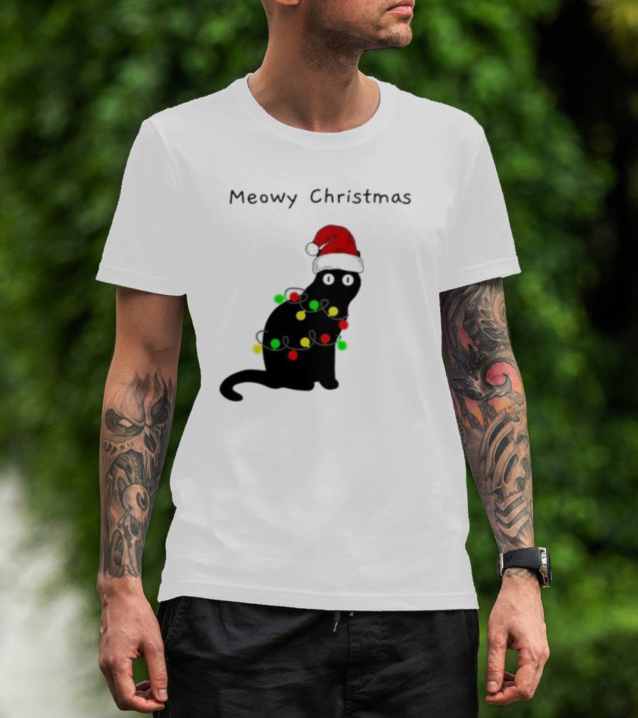 Meowy Christmas Santa Cat With Lights T-Shirt