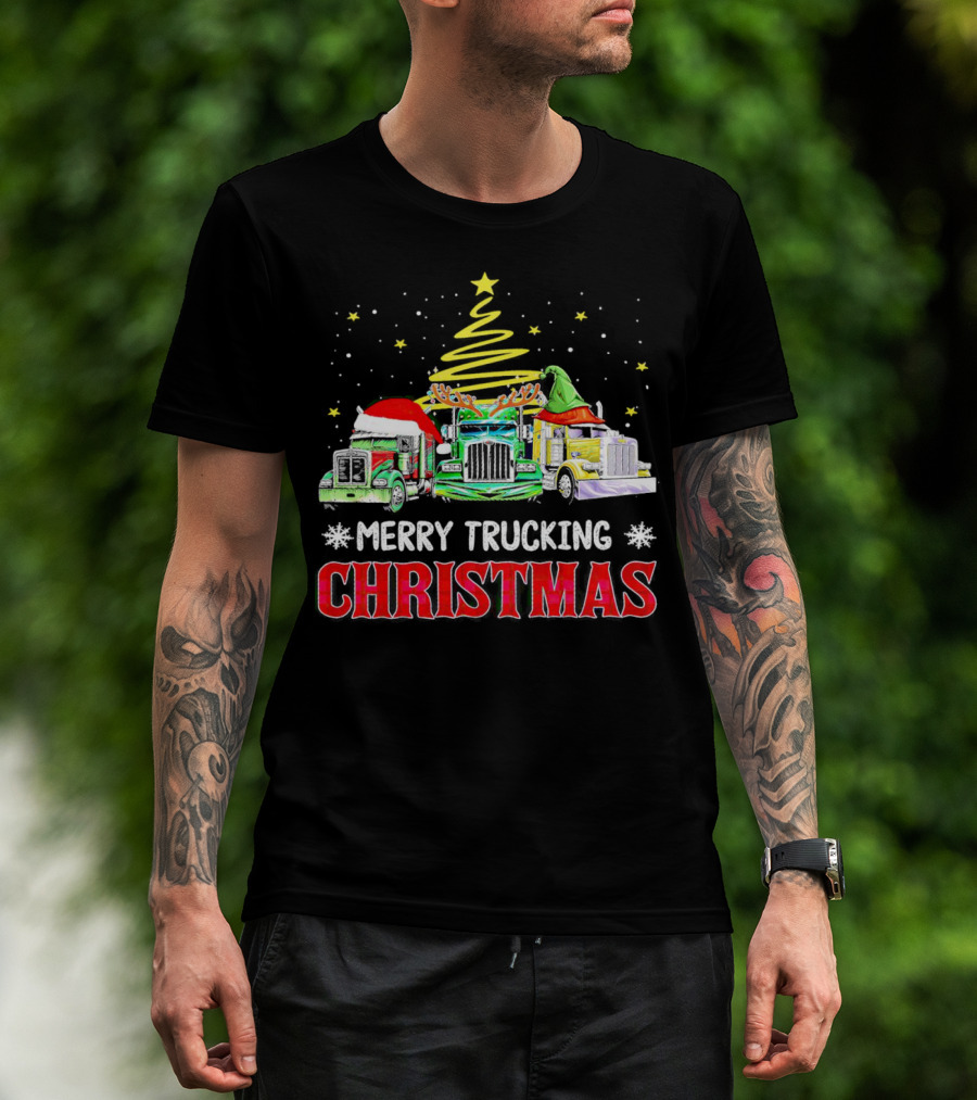 Merry Trucking Christmas With Festive Decorated Trucks And Starry Tree T-Shirt
