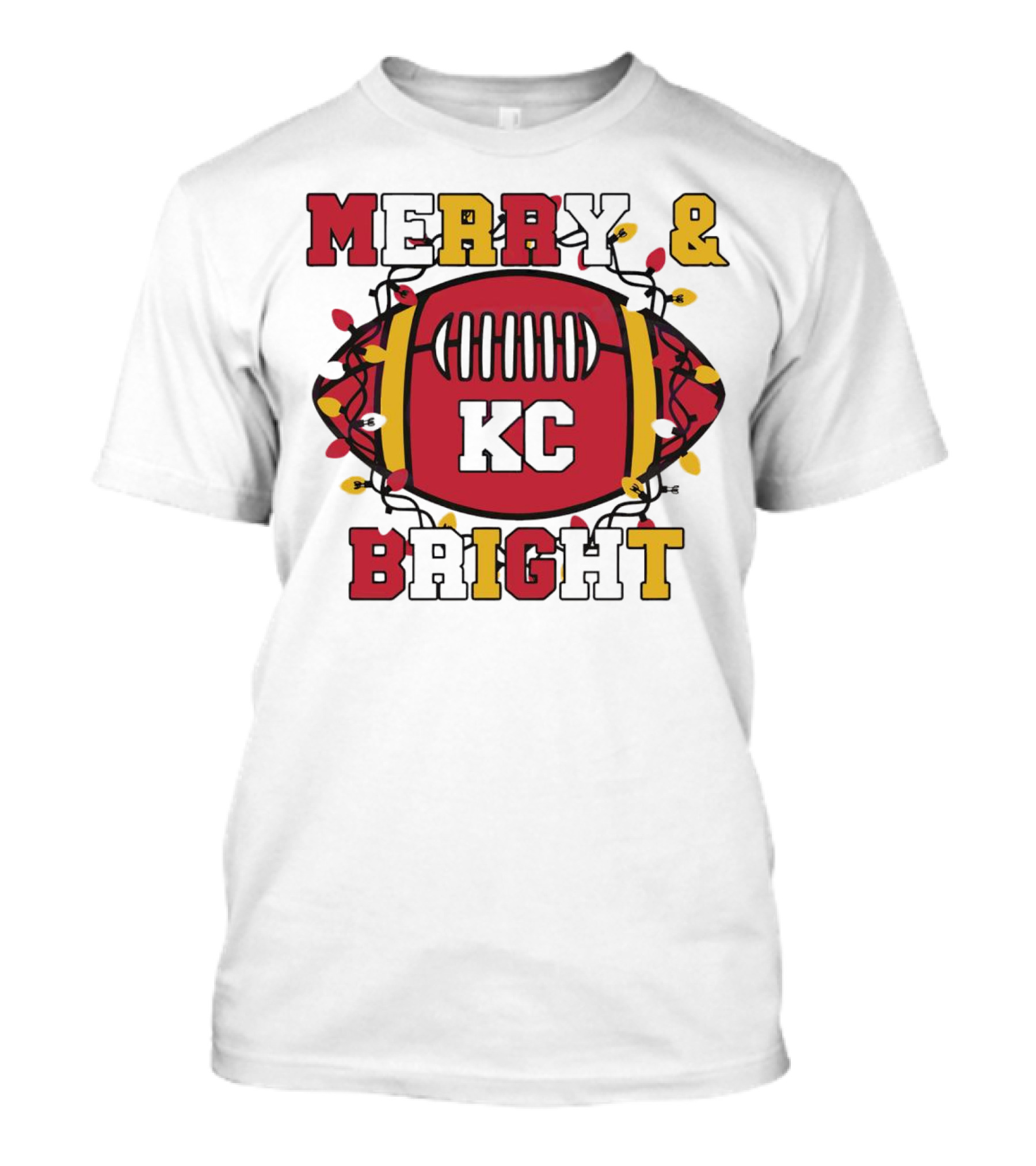 The Kansas City Chiefs Merry and Bright Christmas KC Football Lights T-shirt is designed for everyday wear and a consistent fit. Fabric is pre-shrunk ring-spun cotton with durable stitching. See the size chart below for exact measurements.