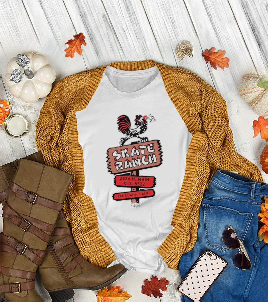 The Skate Ranch Chicken 2526 N Main KI 3-8522 Santa Ana Calif T-shirt is designed for everyday wear and a consistent fit. Fabric is pre-shrunk ring-spun cotton with durable stitching. See the size chart below for exact measurements.