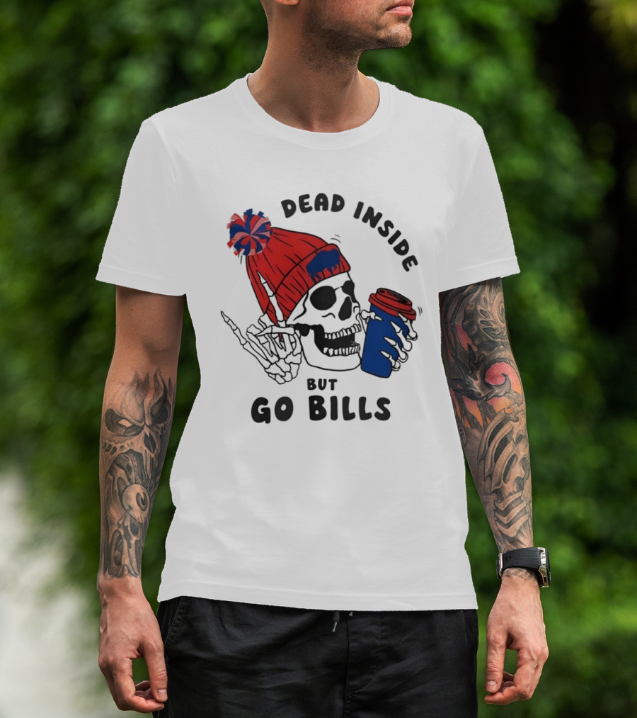Dead Inside But Go Bills Skull Wearing Red Beanie Drinking Coffee T-Shirt