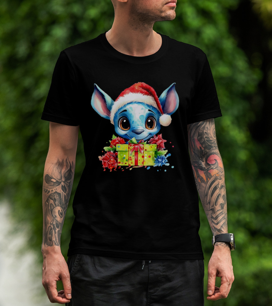 Santa Stitch Holiday Cheer With Christmas Present And Santa Hat T-Shirt
