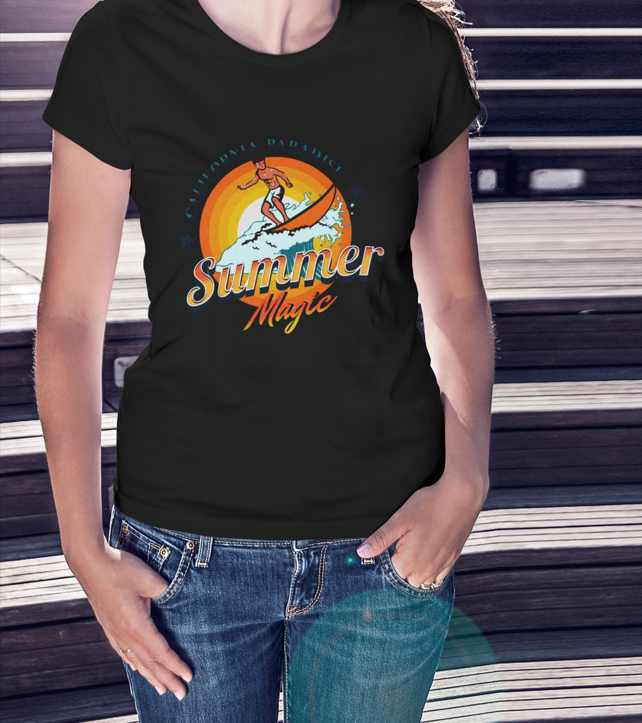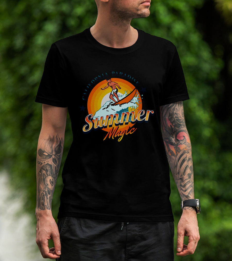The California Paradise Summer Magic T-shirt is designed for everyday wear and a consistent fit. Fabric is pre-shrunk ring-spun cotton with durable stitching. See the size chart below for exact measurements.