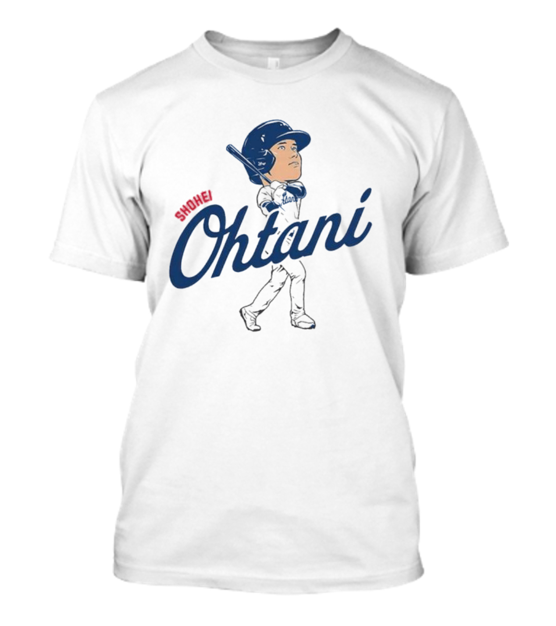 The Shohei Ohtani Baseball Caricature with Blue Helmet and Batting Pose T-shirt is designed for everyday wear and a consistent fit. Fabric is pre-shrunk ring-spun cotton with durable stitching. See the size chart below for exact measurements.