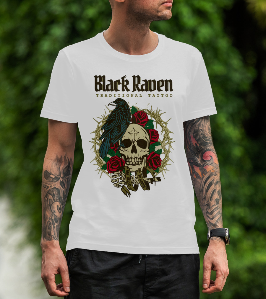 The Black Raven Traditional Tattoo Skull Roses Thorns T-shirt is designed for everyday wear and a consistent fit. Fabric is pre-shrunk ring-spun cotton with durable stitching. See the size chart below for exact measurements.