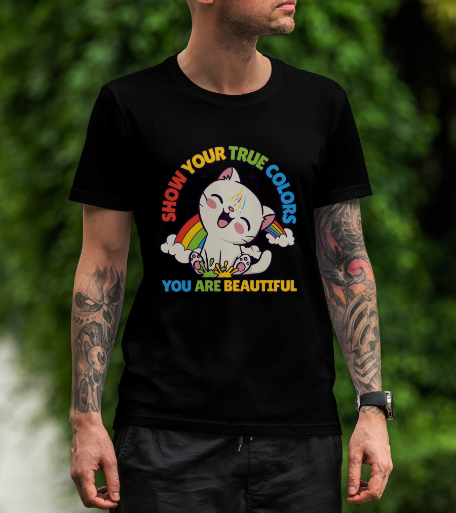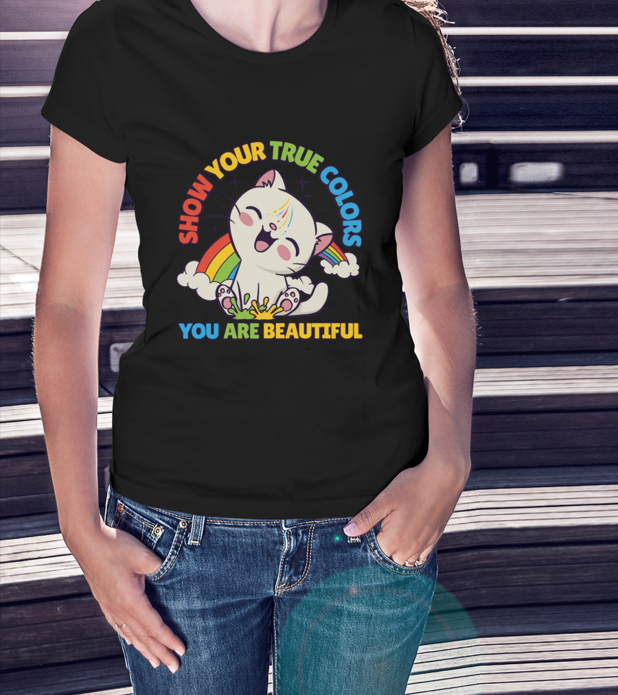 SHOW YOUR TRUE COLORS YOU ARE BEAUTIFUL Cute Cat With Rainbow Elements T-Shirt