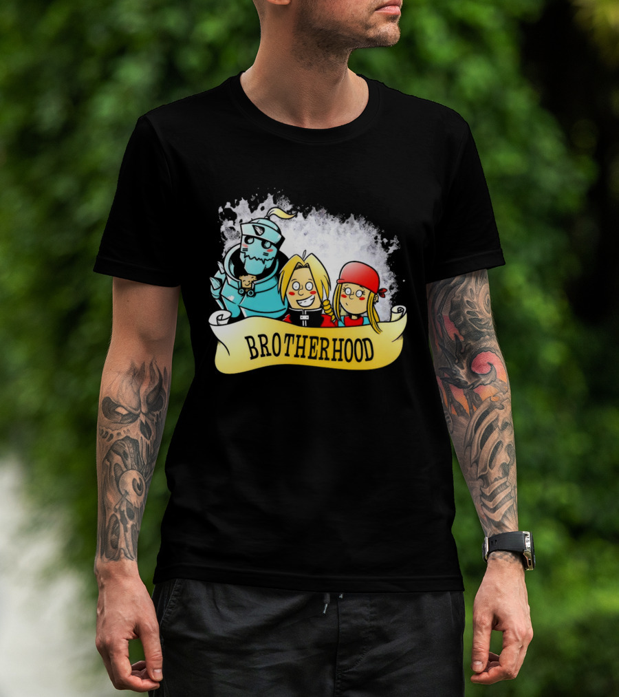 The Brotherhood Alphonse Edward Winry Banner T-shirt is designed for everyday wear and a consistent fit. Fabric is pre-shrunk ring-spun cotton with durable stitching. See the size chart below for exact measurements.