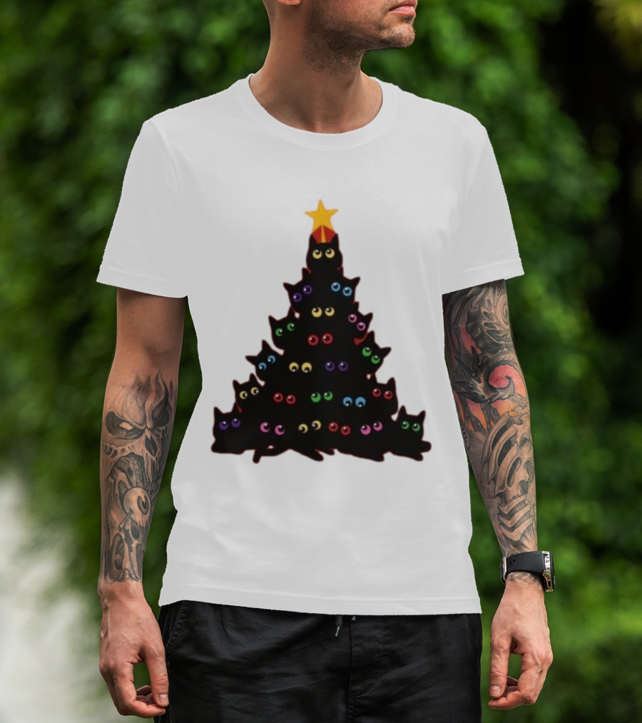 Cat Christmas Tree With Colorful Eyes And Star Top T-Shirt