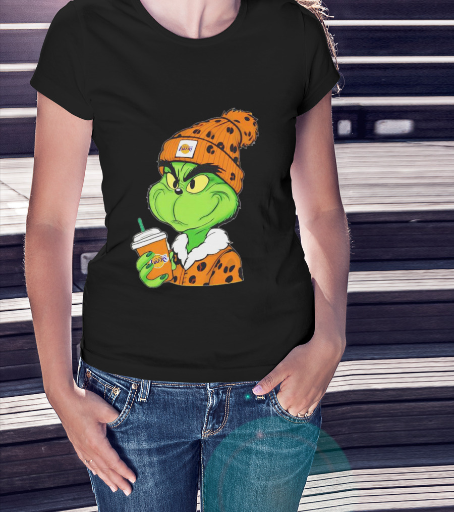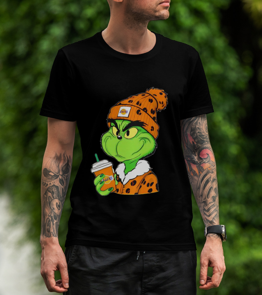 Grinch Drinking Los Angeles Lakers Cup Wearing Beanie T-Shirt