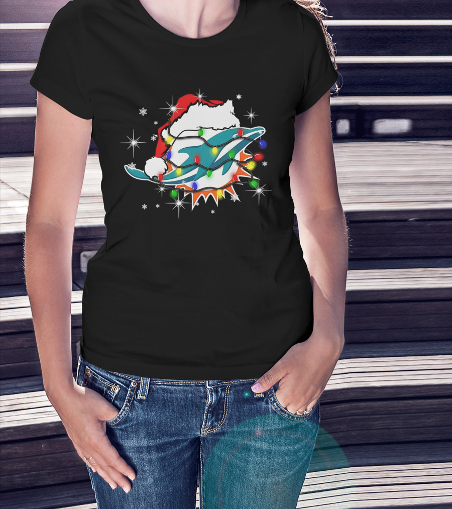 Miami Dolphins Santa Hat Christmas Lights Snowflakes T-Shirt