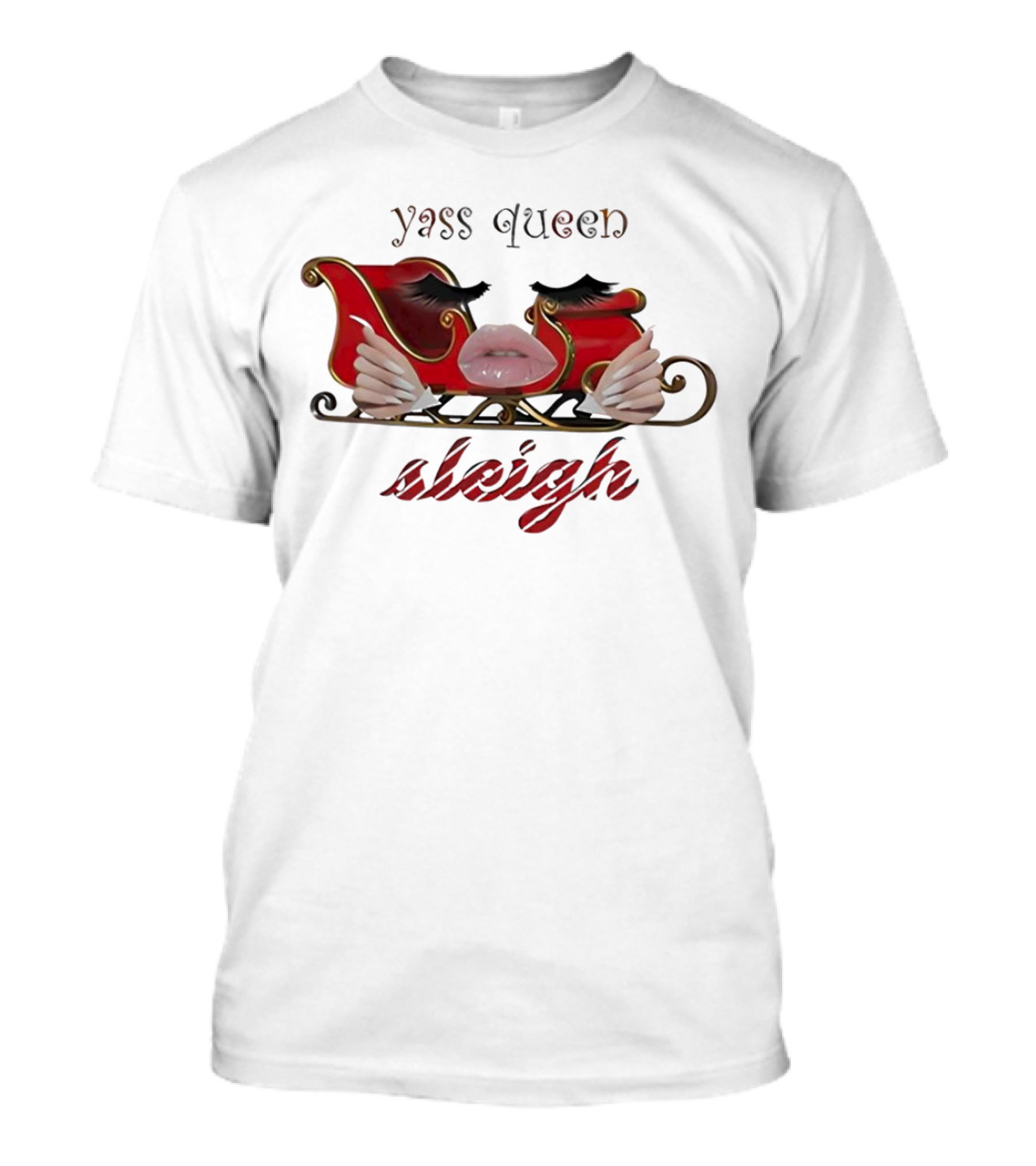 The Yass Queen Sleigh Glamorous Red Lips Eyelashes Fierce Holiday T-shirt is designed for everyday wear and a consistent fit. Fabric is pre-shrunk ring-spun cotton with durable stitching. See the size chart below for exact measurements.