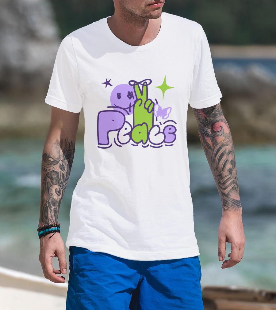 Peace Doodle Smiley Face Butterfly Star Purple Green T-Shirt