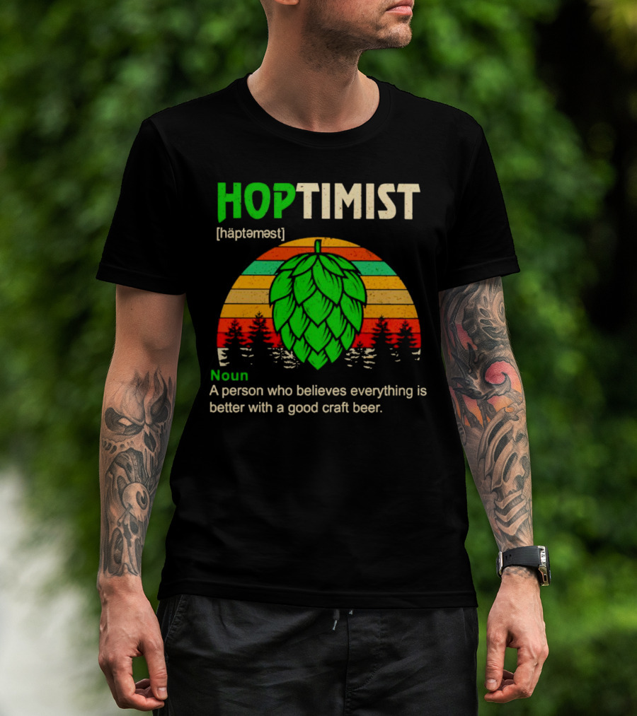 The Hoptimist Noun Definition A Person Who Believes Everything is Better With a Good Craft Beer T-shirt is designed for everyday wear and a consistent fit. Fabric is pre-shrunk ring-spun cotton with durable stitching. See the size chart below for exact measurements.
