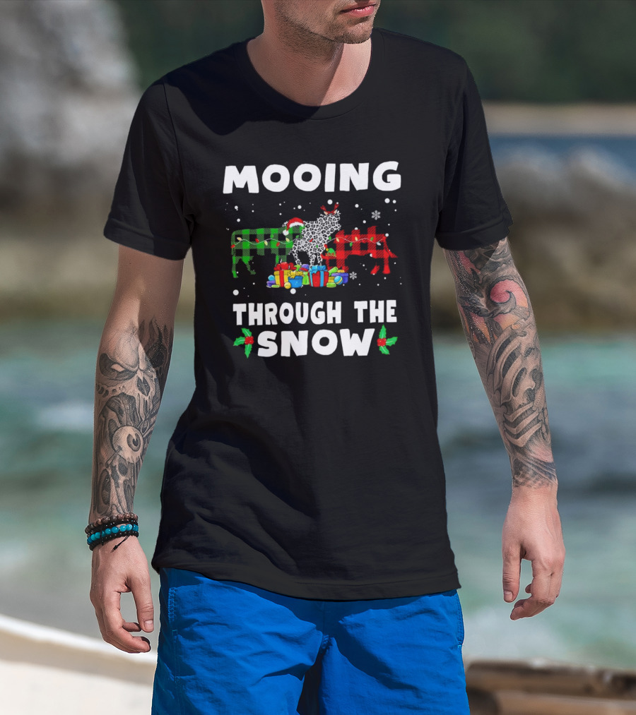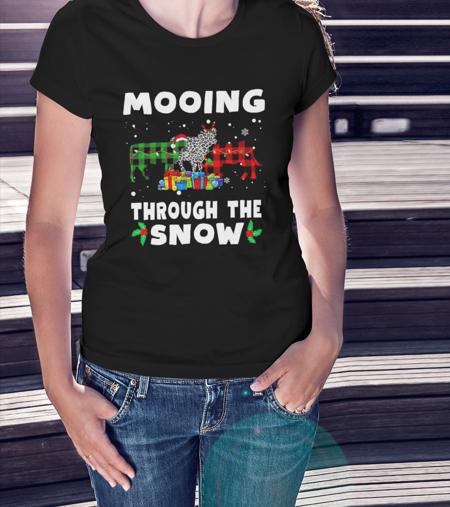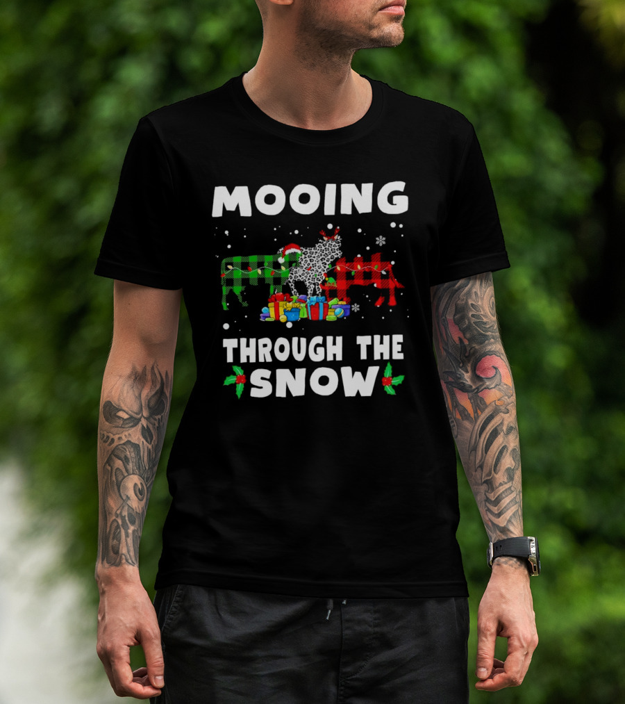 Mooing Through The Snow Christmas Plaid Cows With Presents T-Shirt