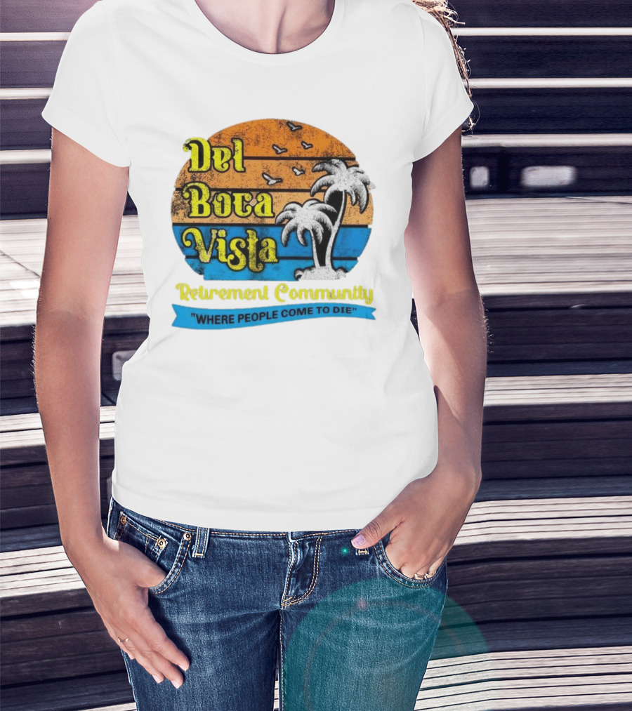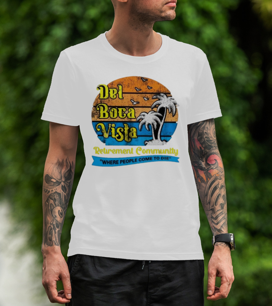 The Del Boca Vista Retirement Community Where People Come To Die Vintage Retro Beach Sunset Palm Trees T-shirt is designed for everyday wear and a consistent fit. Fabric is pre-shrunk ring-spun cotton with durable stitching. See the size chart below for exact measurements.