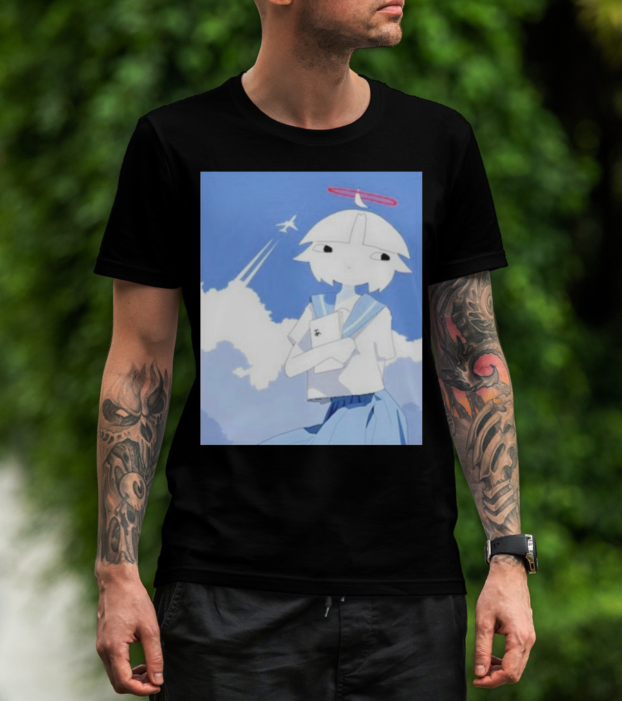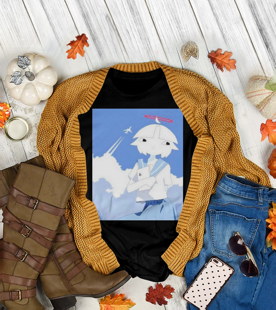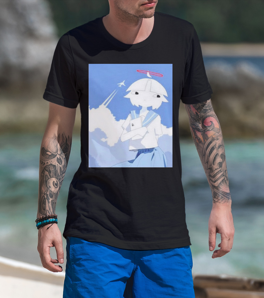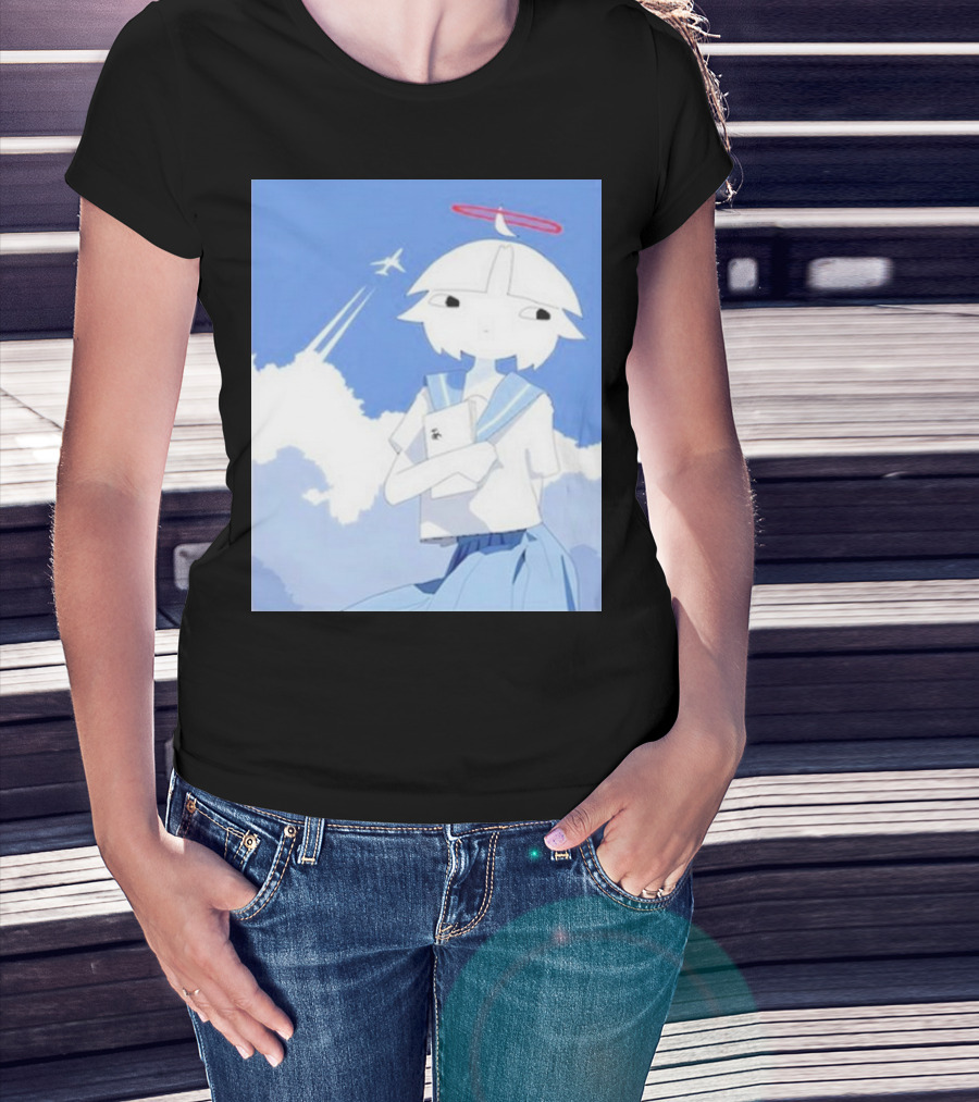 Chew’s District Clowdy Angelic Character Holding Notebook In Blue Sky With Airplane T-Shirt