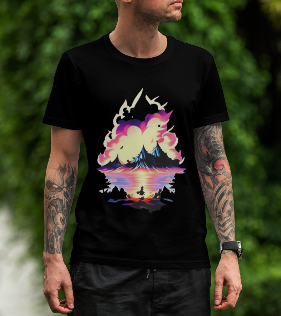 The Fairy Tale Sight Comics Artwork Enchanted Landscape with Mountains and Reflection T-shirt is designed for everyday wear and a consistent fit. Fabric is pre-shrunk ring-spun cotton with durable stitching. See the size chart below for exact measurements.