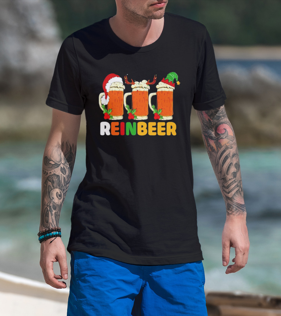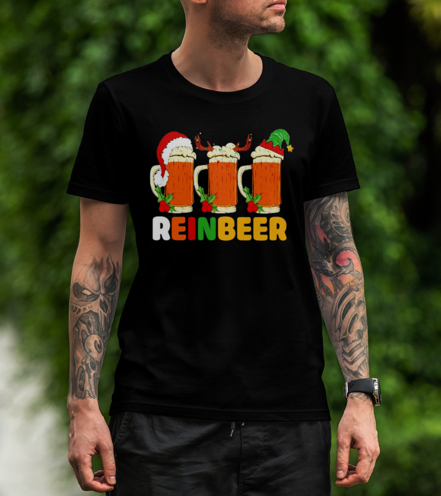Reinbeer Merry Christmas Funny Beer Mugs With Santa And Elf Hats And Reindeer Antlers T-Shirt