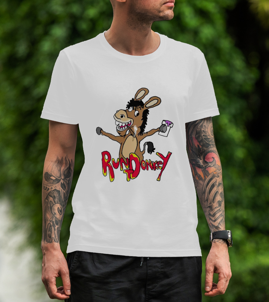 The Rund Donkey Cartoon Character with Paint Can T-shirt is designed for everyday wear and a consistent fit. Fabric is pre-shrunk ring-spun cotton with durable stitching. See the size chart below for exact measurements.