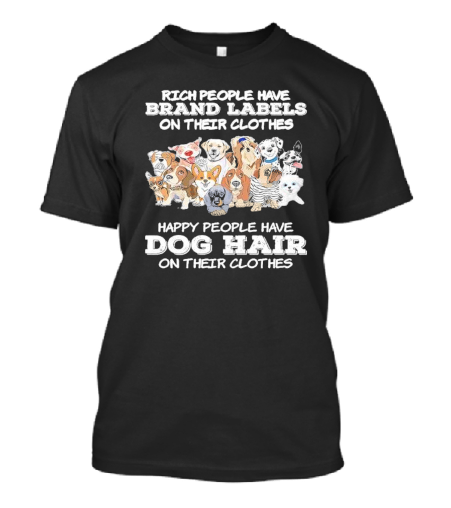 The Rich People Have Brand Labels On Their Clothes Happy People Have Dog Hair On Their Clothes T-shirt is designed for everyday wear and a consistent fit. Fabric is pre-shrunk ring-spun cotton with durable stitching. See the size chart below for exact measurements.
