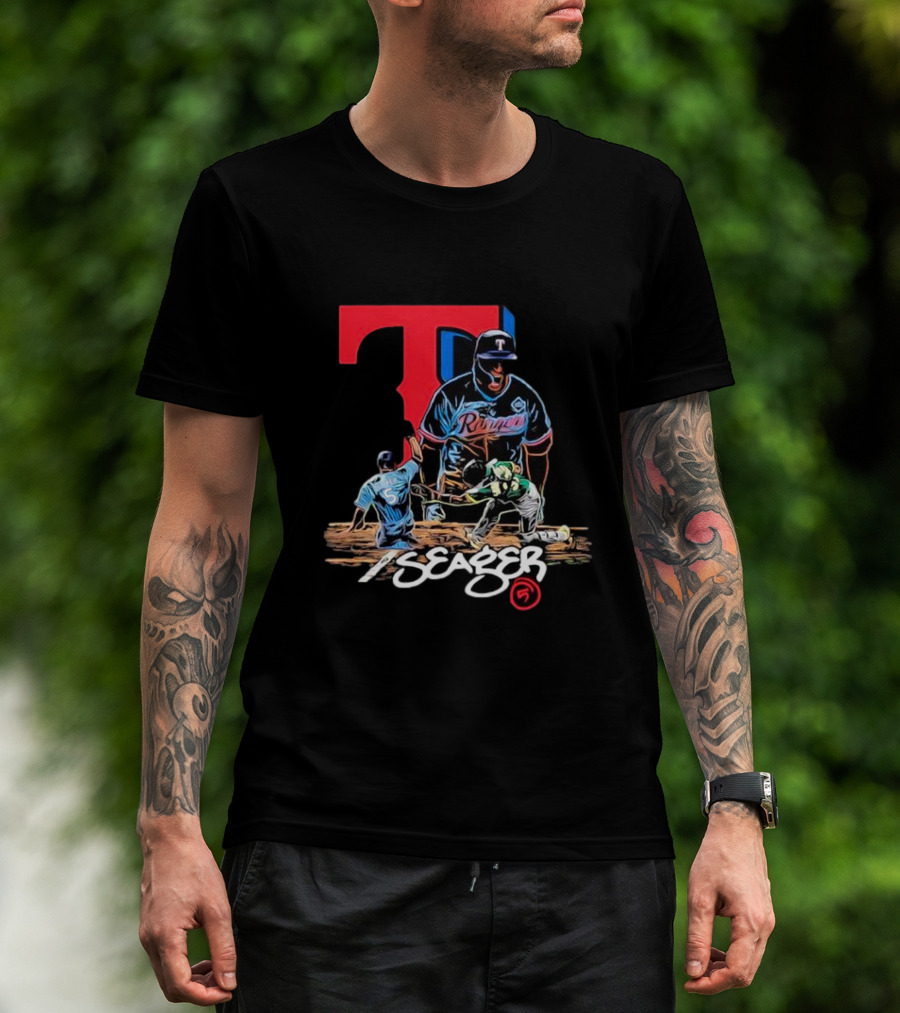 The Texas Rangers Seager Baseball Action T-shirt is designed for everyday wear and a consistent fit. Fabric is pre-shrunk ring-spun cotton with durable stitching. See the size chart below for exact measurements.