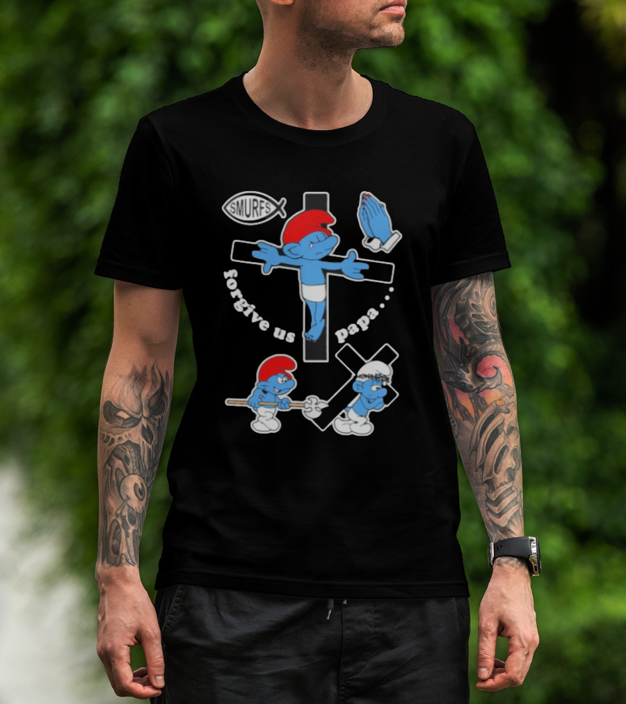 Forgive Us Papa Smurf Jesus Cross And Praying Hands T-Shirt