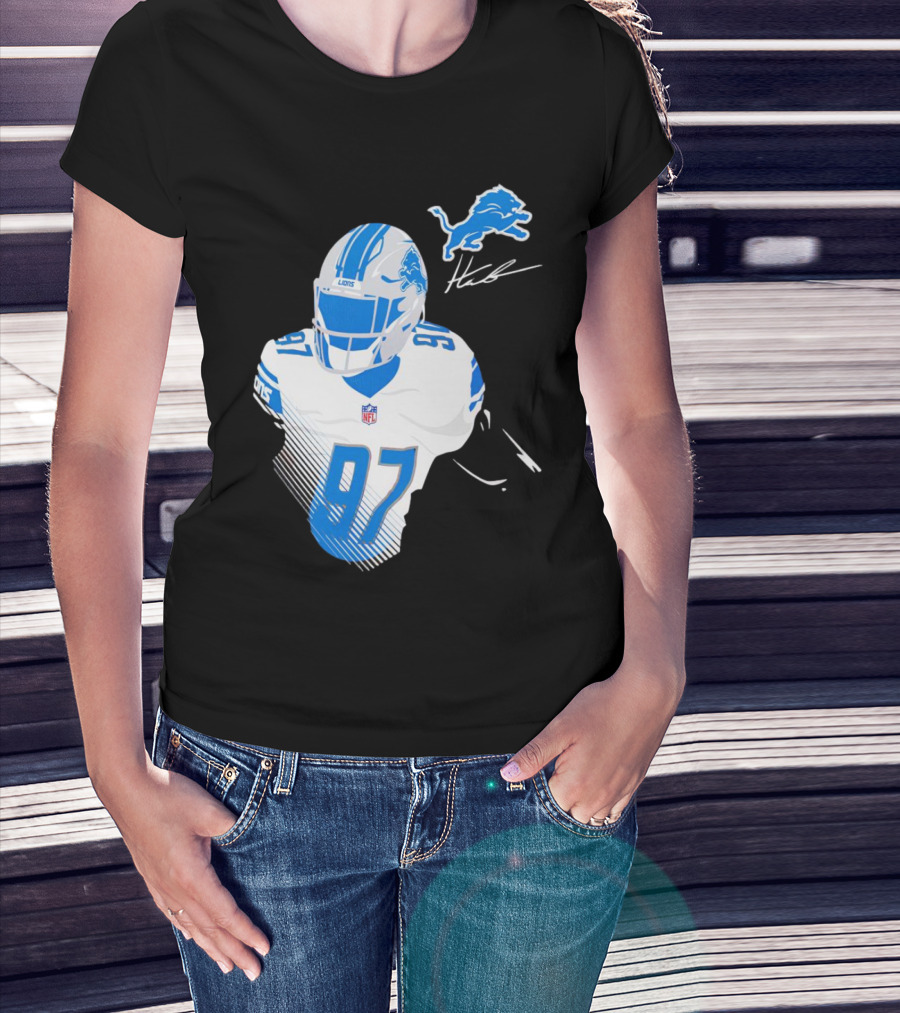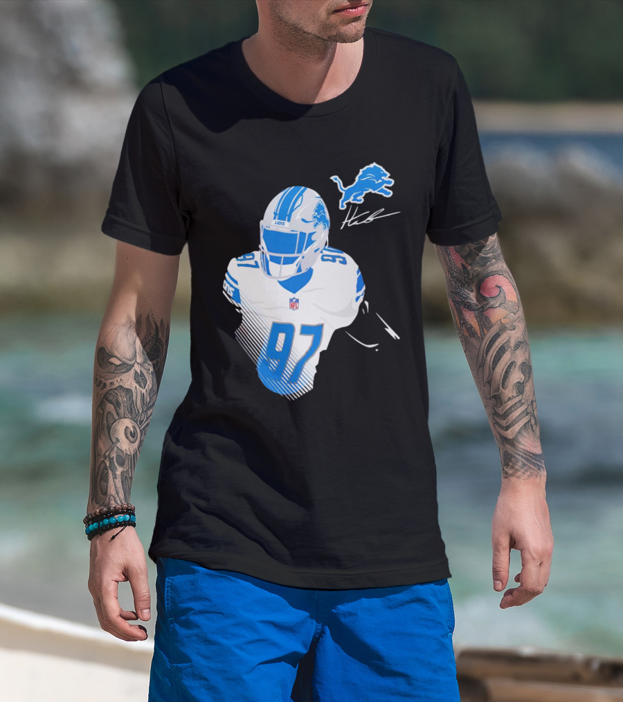 Aidan Hutchinson Detroit Lions Player Signature 97 NFL Logo Lions Helmet T-Shirt