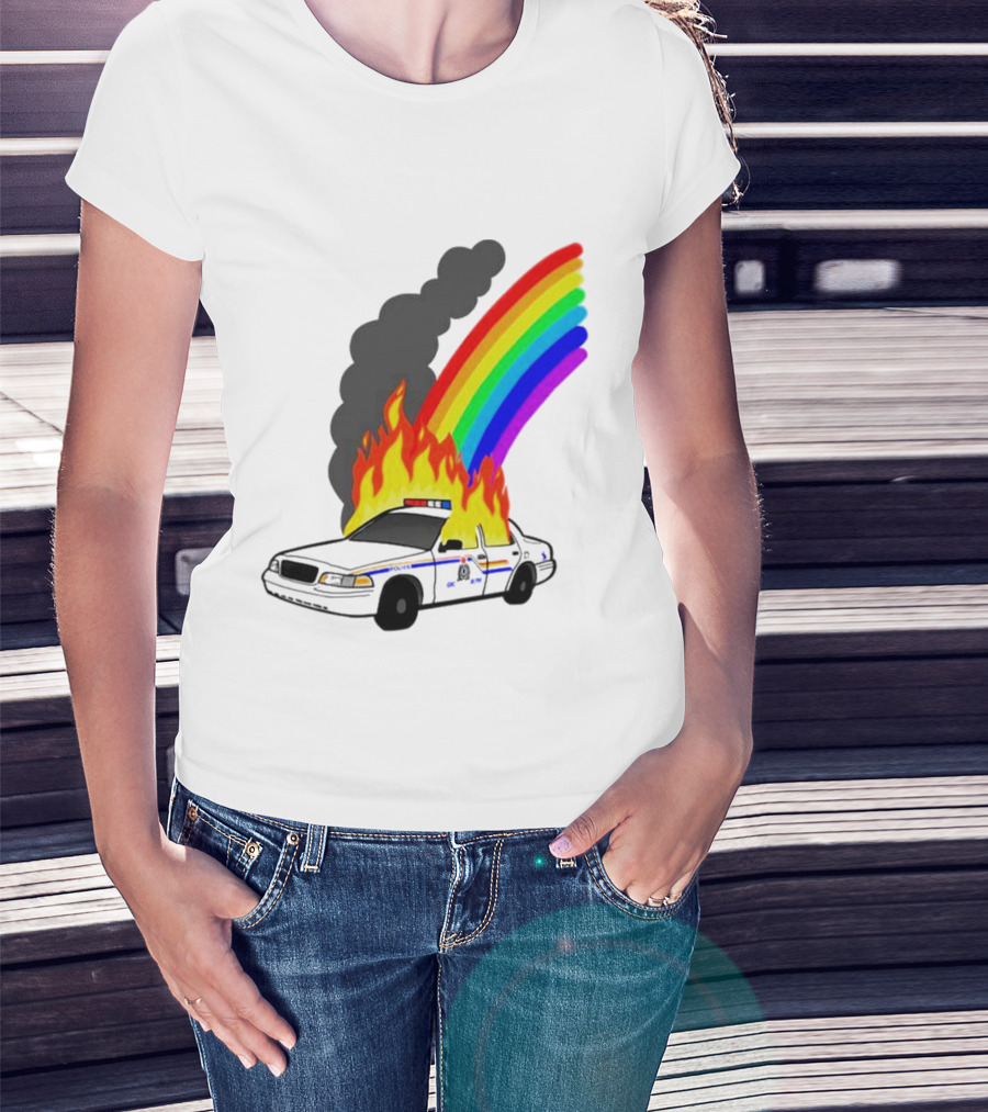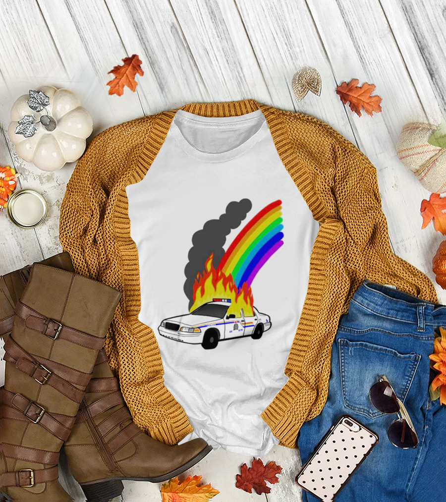 Police Car On Fire With Rainbow Flames T-Shirt