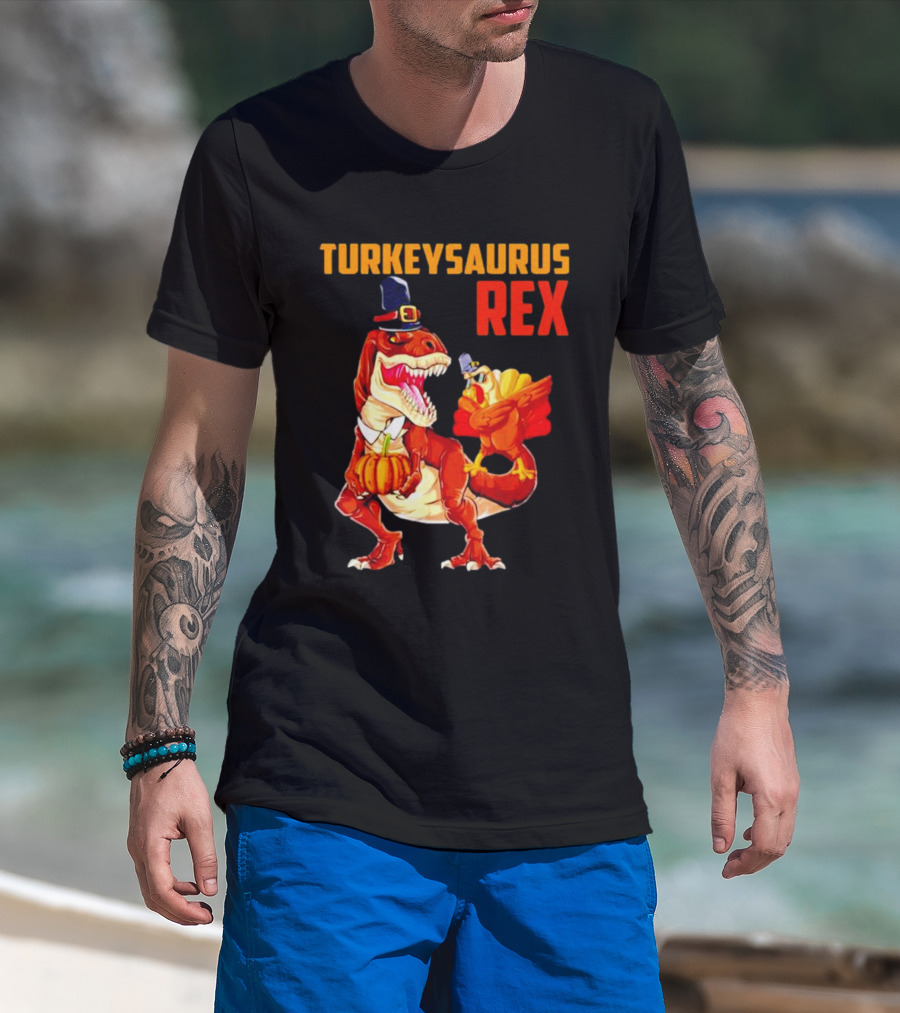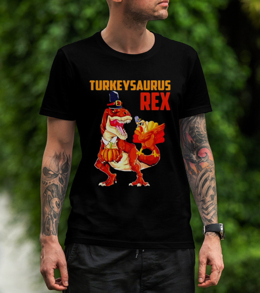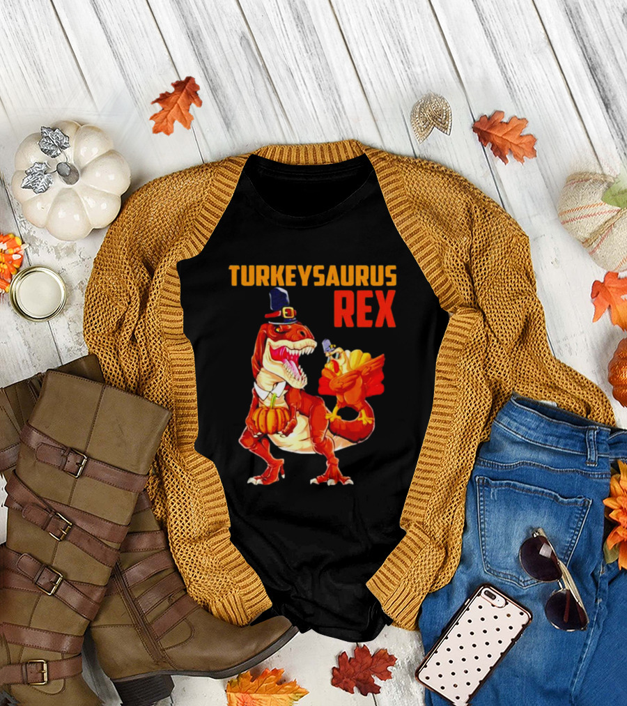 Turkeysaurus Rex Thanksgiving Dinosaur Holding Pumpkin And Turkey With Pilgrim Hat T-Shirt