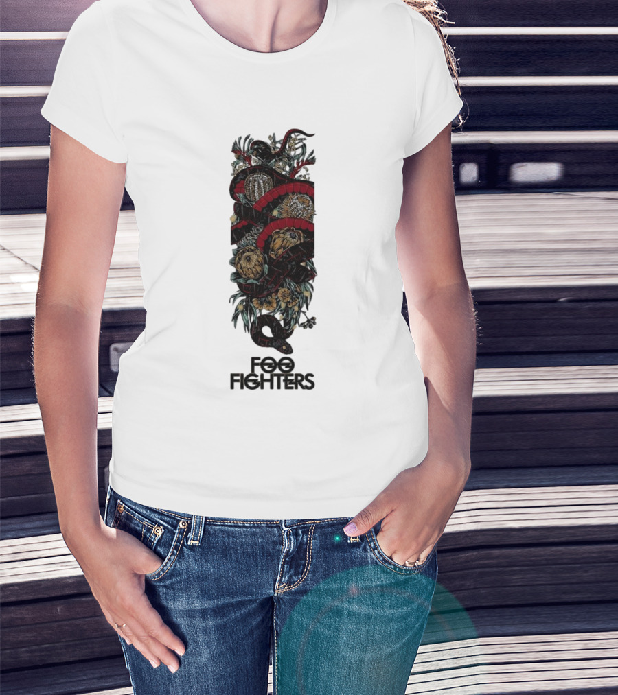 The Foo Fighters Floral and Snake Imagery Dark T-shirt is designed for everyday wear and a consistent fit. Fabric is pre-shrunk ring-spun cotton with durable stitching. See the size chart below for exact measurements.