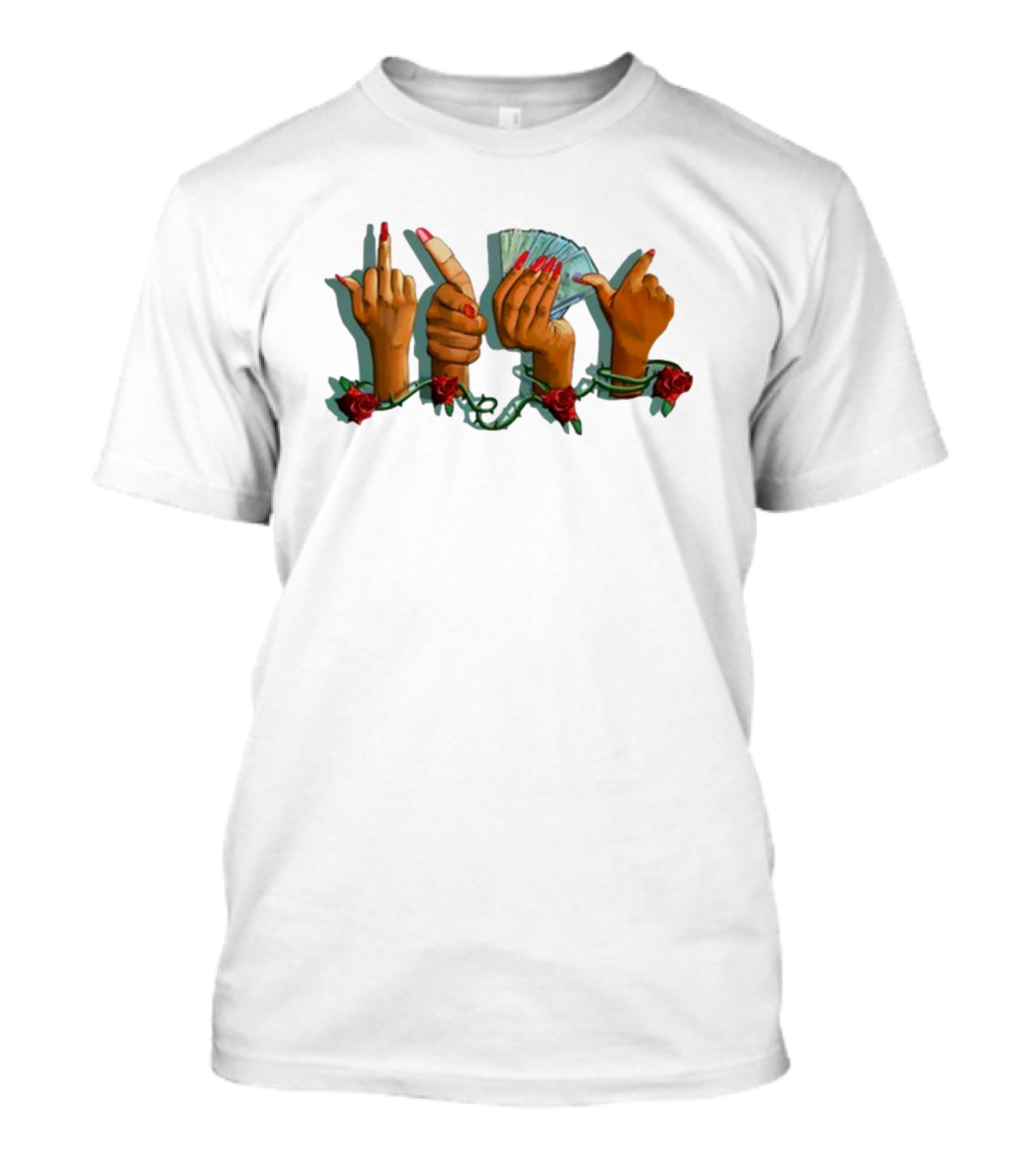 The Mitchell Wearing Madammuse Salmon Fuk U Pay Me Hands with Roses and Cash T-shirt is designed for everyday wear and a consistent fit. Fabric is pre-shrunk ring-spun cotton with durable stitching. See the size chart below for exact measurements.