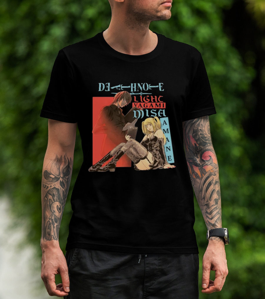 The Death Note Light Yagami Misa Amane T-shirt is designed for everyday wear and a consistent fit. Fabric is pre-shrunk ring-spun cotton with durable stitching. See the size chart below for exact measurements.