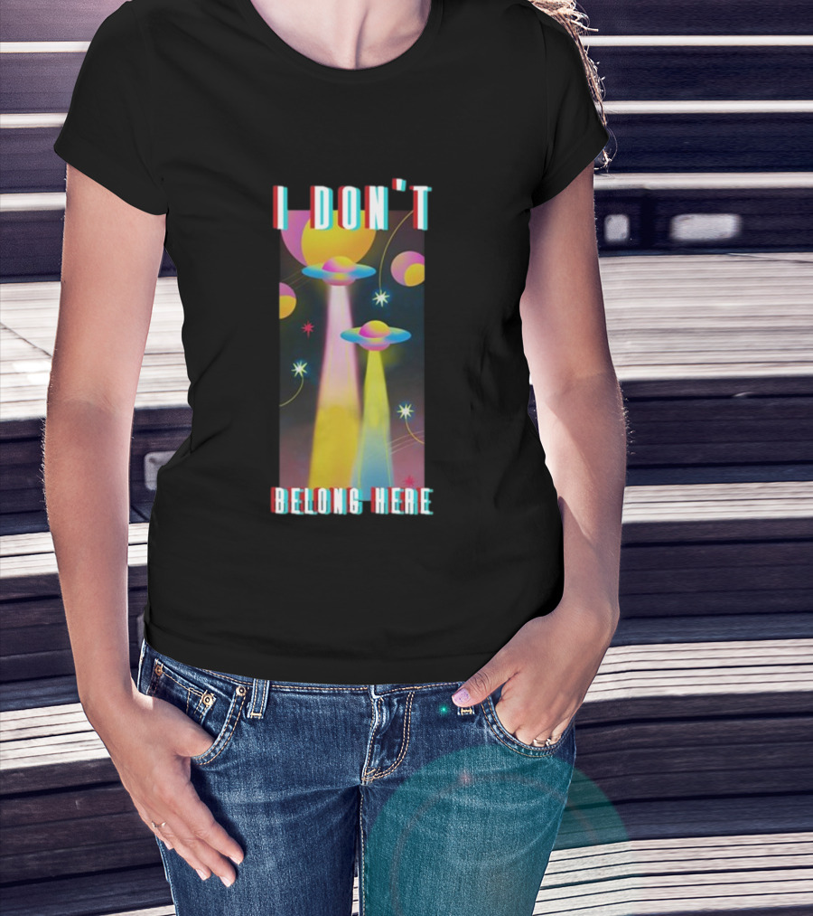 I Don't Belong Here UFO Spaceships Colorful Cosmic Scene T-Shirt