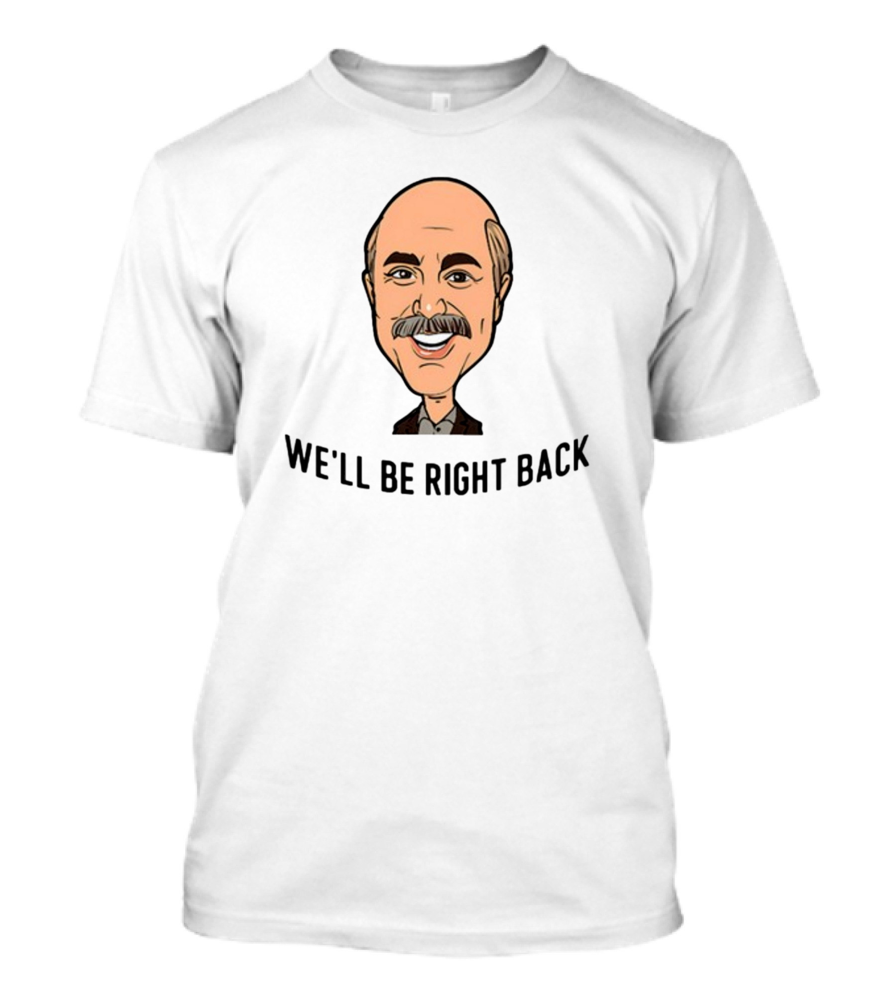 The Adam Ray Dr. Phil Cartoon We'll Be Right Back T-shirt is designed for everyday wear and a consistent fit. Fabric is pre-shrunk ring-spun cotton with durable stitching. See the size chart below for exact measurements.
