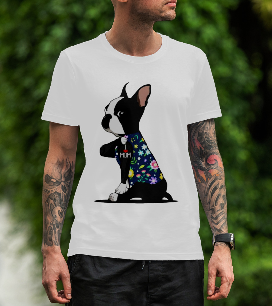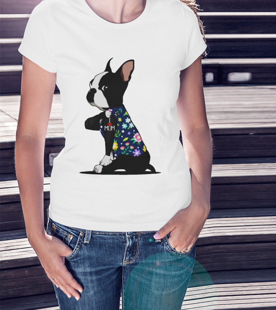 Boston Terrier I Love Mom Flower Tattoos T-Shirt